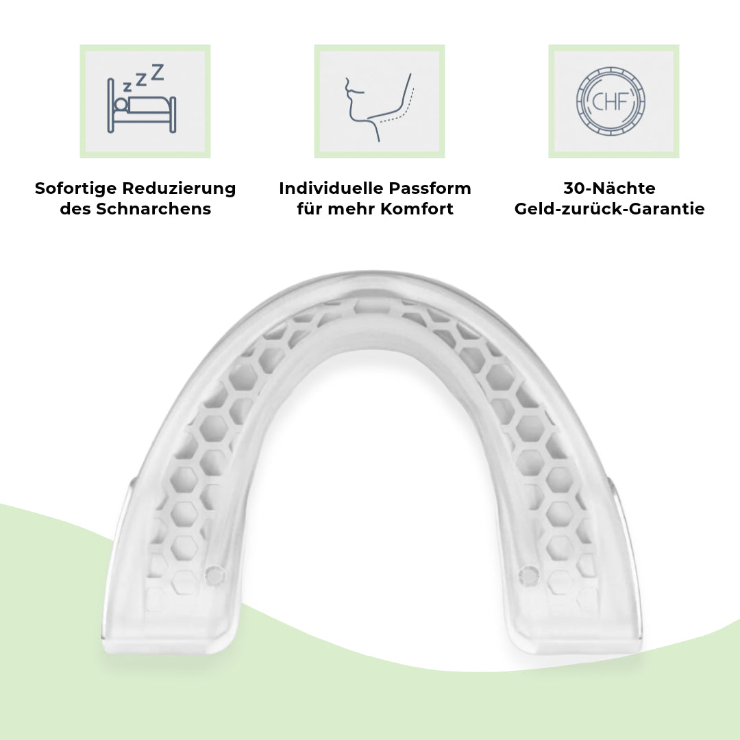Das Gerät aus weichem Silikon verschiebt sanft den Kiefer, um die Atemwege zu öffnen. So wird das Schnarchen reduziert und die Atmung verbessert, ohne Unbehagen. Bereits nach der ersten Nacht genießt du ruhigeren Schlaf und mehr Erholung.
